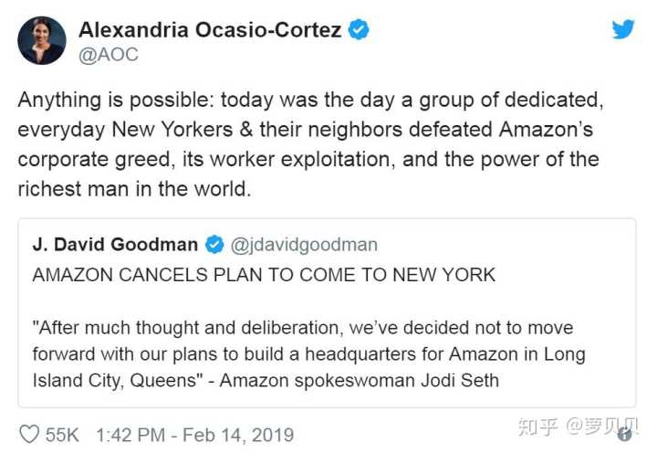 不幸的是愤怒政治从来不理性独立思考,社交网络更起到了推波助澜的作用。AOC一条条tweeter一点点蚕食掉了纽约的未来。当得知亚马逊取消纽约总部计划时,AOC在tweeter上大肆庆祝。