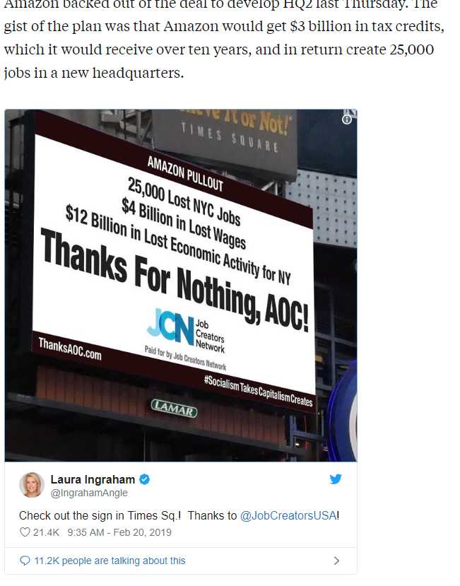 另外AOC只是断章取义,专门选取对她有利的论据,而选择性忽略其他关键性证据。AOC只是关注于纽约市政府和州政府承诺给予亚马逊30亿美元的安家补助,但忽略了亚马逊将来可以创造的价值以及对于城市的回报。单就4万个就业岗位,年薪10万,每年就可以产生4亿美元的税收。这些就业人口的个人税收在2030年前就可以填补30亿美元补贴,这还没算企业所要上缴的税款呢。