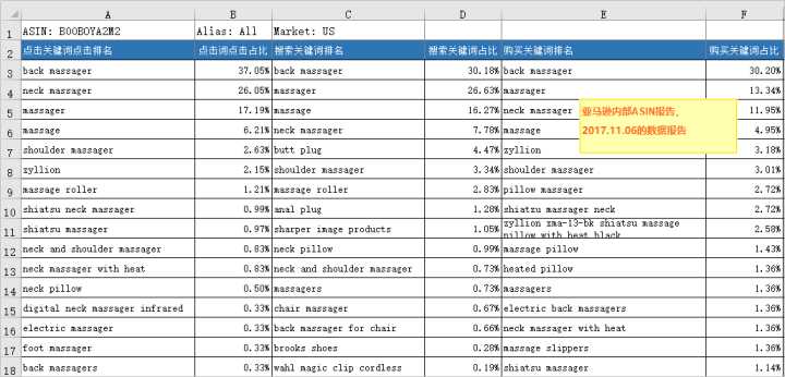 这是该产品的ASIN数据报告(市场价大概200-300元一份),包括一个时间段的搜索、点击、购买的核心关键词,以及每天自然搜索的销量。