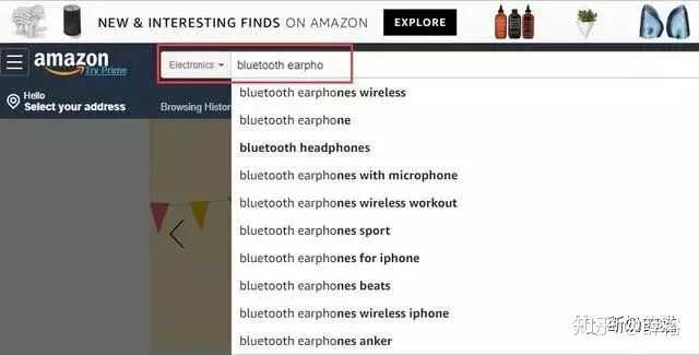 继续以耳机为例,把该产品的核心关键词放在亚马逊首页搜索栏All department和大类目Electronics这两栏里面去试,如下图所示可以清楚的看到,在产品关键词还只输入到一半的时候,下拉框搜索栏里已经出现了许多跟产品相关性很高的精准关键词及长尾关键词。