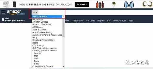再把这些核心关键词放进亚马逊首页搜索框去搜索,需要注意的是,搜索框必须得是“All Departments”这一项,这样搜索出来的词才更精准,才能更好的为己所用。