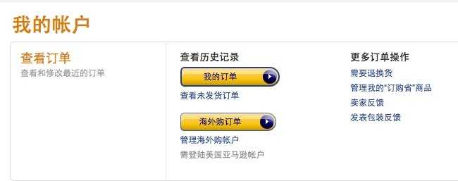 第一步,进入中国亚马逊我的账户页面,可见,查看订单里,有两个黄色按钮,我的订单和海外购订单