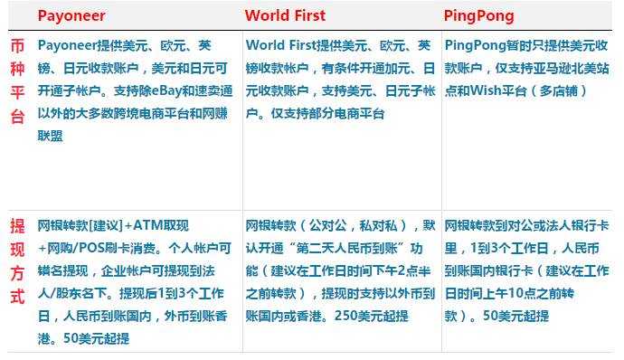 一、发展历史Payoneer,简称P卡,是一家在2005年于美国成立的跨境资金下发公司,是亚马逊目前唯一官方推荐的收款方式,提供全球支付解决方案,还可以像美国公司一样接收美国B2B资金。World First,简称WF卡,是一家在2004年在英国成立的外汇兑换公司。PingPong金融是一家在2014年成立的国内首家跨境收款平台,专注为中国跨境电商提供亚马逊收款服务。二、开户1、美国银行账户需要自己本人到美国或找中介公司代理注册美国公司然后开通美国银行账户。整个周期会需要一个月以上,且费用在1万到2万。2、香港银行账户目前个人开户已经比较难,由于大量个人账户用于接收境外的商业款项,导致香港各银行严控严查内地个人开户。公司开户需先注册香港公司,费用在几千人民币,周期在一个月以上。3、WorldFirst目前开户非常灵活,账户分为两种,个人账户和公司账户,个人账户持个人身份证即可开通,公司账户需提交公司营业执照。开通时间一般在一到三天。World First支持开通美元、英镑、欧元、加元、日元五个币种帐户。开户过程全免费。4、Payoneer目前开户也比较灵活,可开个人账户和企业账户。Payoneer提供美元帐户、欧元帐户,英镑帐户、日元帐户四个收款帐户帐号,可以分别从美国、欧盟、英国和日本公司接收资金。一般情况,开通Payoneer帐户时就默认开通美元、英镑、欧元、日元四个币种帐户。5、 PingPong金融目前仅开通美元帐户帐号。亚马逊现在暂时只能注册企业账户,Wish可开个人账户和企业账户。三、卡的性质Payoneer可以开通无卡帐户,也可以申请实体卡用于购买海外消费;而WorldFirst和PingPong金融均只能开通无卡帐户;美国银行账户和香港银行账户只能开通实体卡。这里所述的无卡帐户,均是指虚拟帐号。四、年费与转帐费率Payoneer卡、WorldFirst、PingPong卡三家收款帐户均可通过登录各自官网进行网上自助转款,但在转帐费率方面存在高低区别,具体如下:1.Payoneer的年费与转帐费率(1)Payoneer实体卡收费:Payoneer实体卡帐户管理费每年$29.95。没有申请实体卡的则无需收取年费。Payoneer实体卡可在国内ATM取现,但跨境提现费用较高,如无需要则无需办理实体卡,同时也不建议在境内提现或刷卡。(2)Payoneer无卡帐户:美国帐户入帐收1%费用,其他帐户免费入帐;提现费用方面,全部帐户(美元帐户、欧元帐户,英镑帐户、日元帐户)均收取2%的转款费率最低可至1%;无汇损。2.World First的年费与转帐费率(1)World Firs卡无年费,卖家登录WF卡后台提现的手续费用为1%-2.5%;无汇损。(2)如果是通过WorldFirs的客户经理提现,除了要收取手续费用1%-2.5%以外,当英镑和欧元的单笔转帐金额小于500英镑/欧元时,需收10英镑/欧元费用;当美金和加币的单笔转帐金额小于1000美金/加币时,需收取30美金/加币费用。3.PingPong金融的年费与转帐费率PingPong卡无年费,转款时1%费用封顶,无其它附加费用,目前是亚马逊全球收款最低费率的收款帐户。五、注册地址1.Payoneer官网申请注册地址为:https://www.payoneer.com/zh/2.World First 官网申请注册地址为:https://www.worldfirst.com/cn/online-sellers/3.PingPong的官网申请注册地址为:https://www.pingpongx.com/zh/index.html
