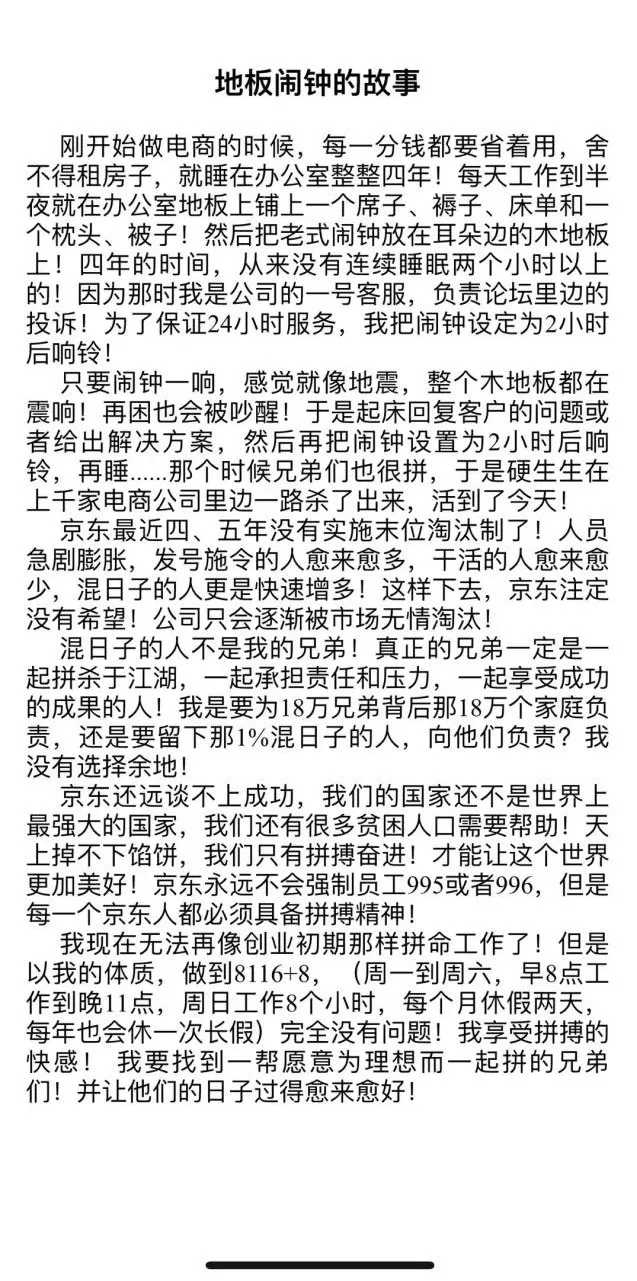 但随着京东日益成熟,成为一个拥有17万员工的庞大公司,这种打鸡血的战斗文化已经逐渐稀释。刘强东显然对此很忧虑,数天前又讲了自己当年“地板闹钟”的故事,试图唤起京东员工的创业精神。