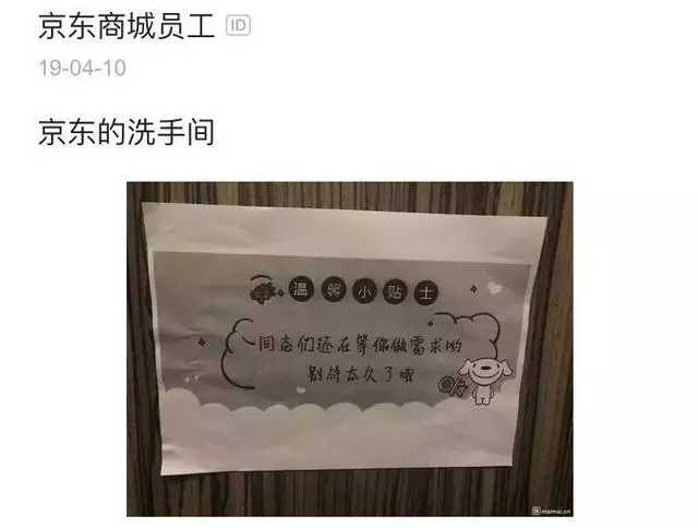 过去,厕所里常有人玩手机逃避工作,有时等20分钟都不见人出来。如今,上厕所的时间也像加班时长一样,被有的部门领导列入到考核里,决定着绩效和工资。在有些地方,还贴上了号召大家“上厕所快一点”的标语。因为“上厕所太慢的人”不符合京东的价值观”。