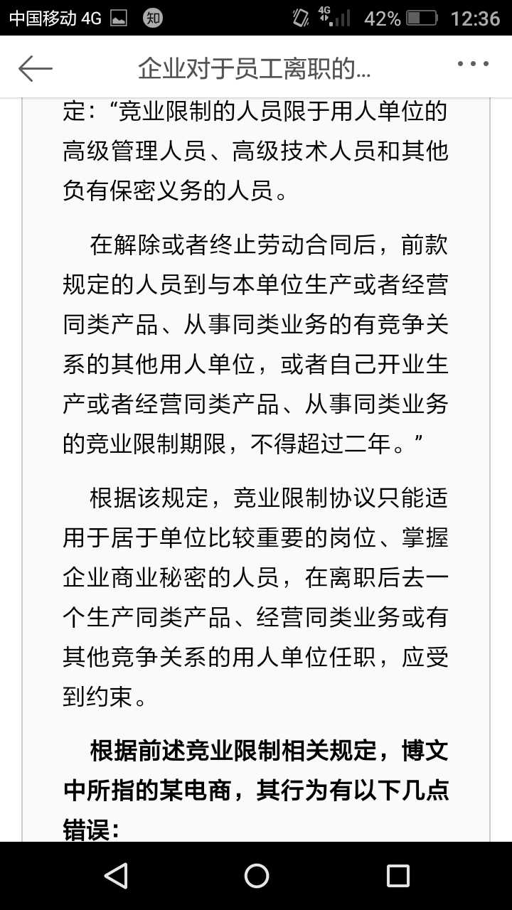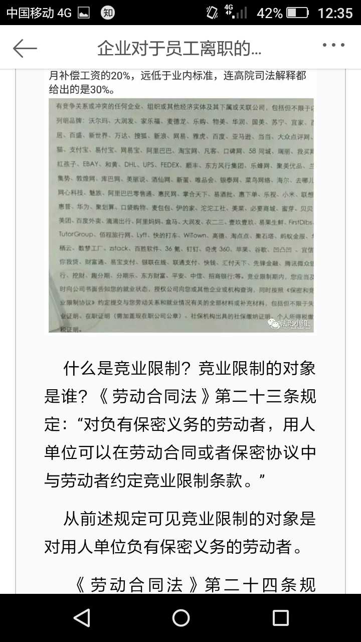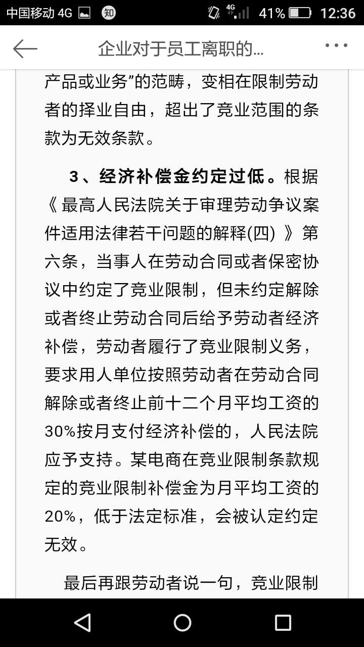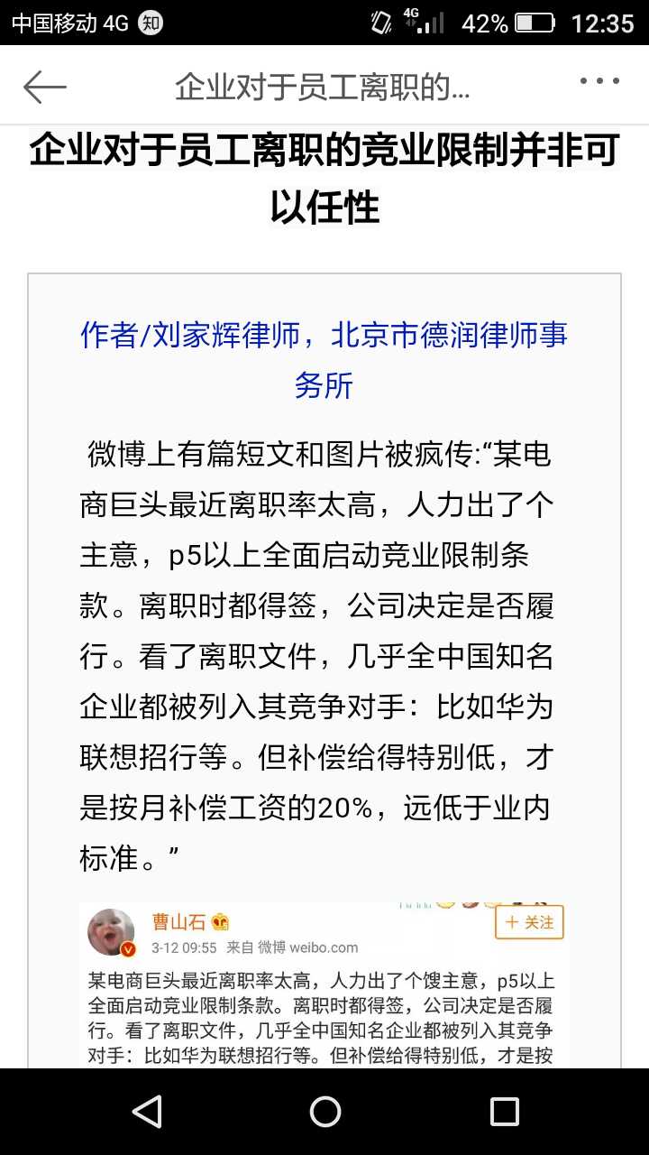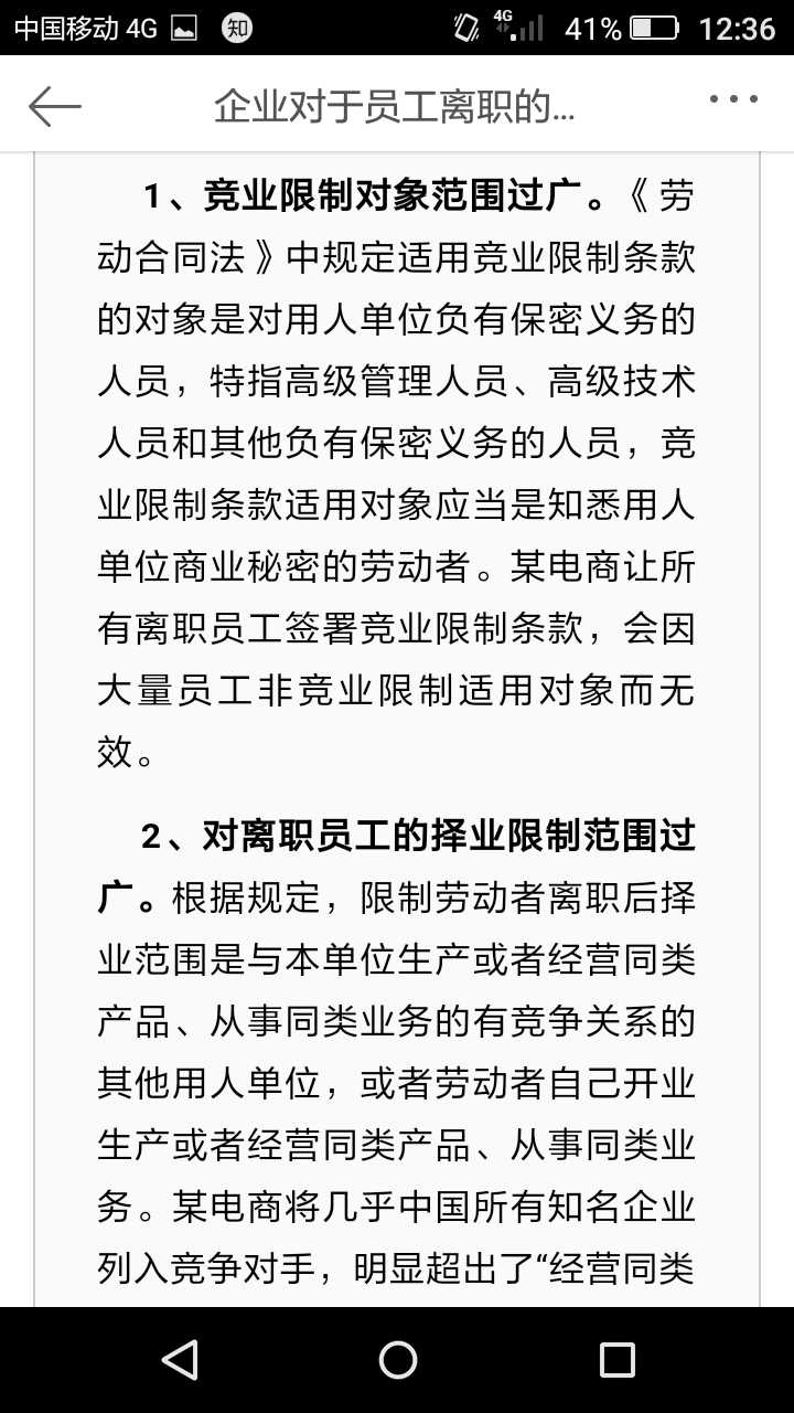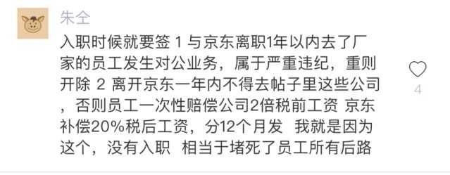 如何看待疑似京东离职竞业限制条款被曝光? 爱开淘 七月 2, 2019 业务发展 20 评论 1384 围观 微博知名财经博主曹山石今日曝出,某电商巨头最近离职率太高,人力出了个馊主意,p5以上全面启动竞业限制条款。离职时都得签,公司决定是否履行。看了离职文件,几乎全中国知名企业都被列入其竞争对手:比如华为联想招行等。但补偿给得特别低,才是按月补偿工资的20%,远低于业内标准,连高院司法解释都给出的是30%。 [图片] 有网友点明,名单中竟然没有京东,所有这份条款极有可能就是出自京东之手,如何看待这件事呢?