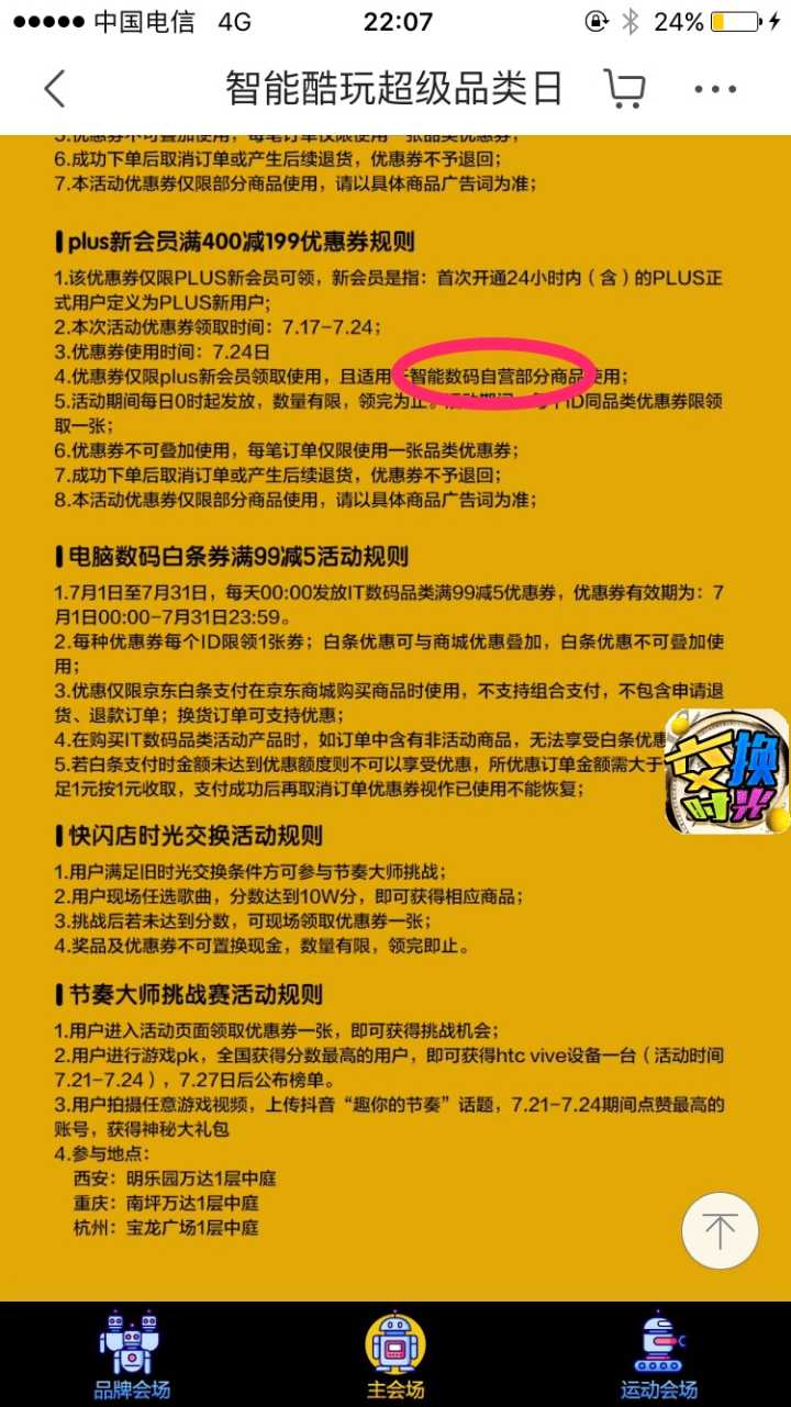 7月24号,东汪某活动最后一天。如图,这个活动的亮点是999减500券,当然,如果你想抢这个券,你会经历三个过程:等待抢券;网路拥堵;券已抢完。因此我的注意力转移到400减199的plus新用户券上。减免的幅度已经超过plus会员的开通费用(我是188元)。没写哪个类别可用,是都可以用的意思吗?当然,我担心东汪又坑我(毕竟不是第一次,文后我会提下东汪第一次是如何坑我的),我一定要确认一下券的详细说明。券的说明那是藏得相当好!光点击是不会给你看说明的。一个有几百张图片的网页,抢券在顶部,券的说明在底部,光拖页面就要十多秒。