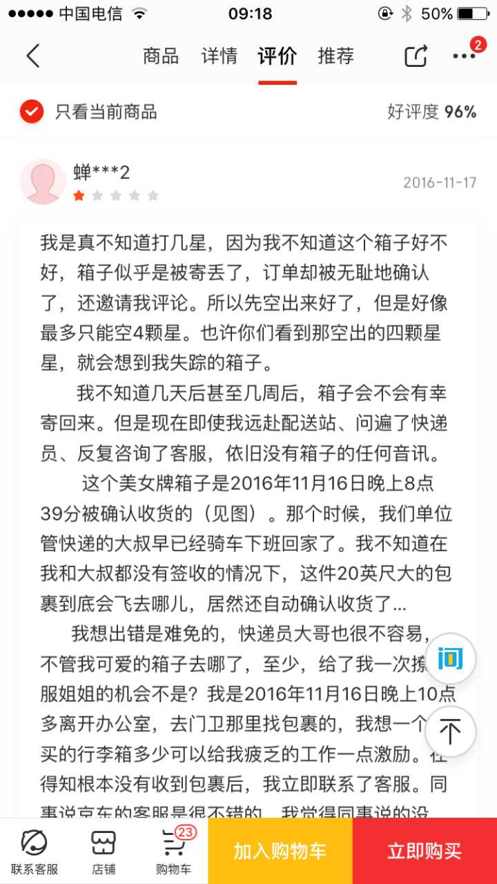 话说我第一次被东汪坑,是因为双十一买了个旅行箱,没收到货,订单就被确认了,居然还邀请我评价…评价…价… 那个商品评价居然收到了一百多个赞,比我在知乎上的最高赞还多… 如下: