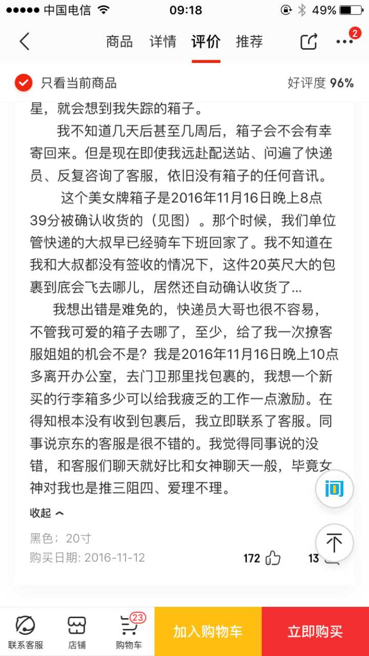 appendix:话说我第一次被东汪坑,是因为双十一买了个旅行箱,没收到货,订单就被确认了,居然还邀请我评价…评价…价… 那个商品评价居然收到了一百多个赞,比我在知乎上的最高赞还多… 如下: