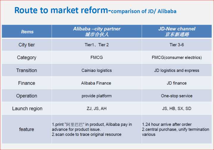 阿里巴巴推出的“城市合伙人”深入社区零售,提供货源、物流和金融等一系列服务,并为有志青年提供创业平台;京东强调跨过经销商和二批,利用其自建的京东物流直接将厂家的商品直接供货到终端零售店内。终端门店老板只需要在家里点开APP,就可以直接下单订货。
