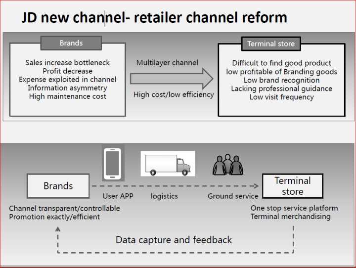 线上巨头向线下终端渗透,尤其是京东有其自身优势(货源+物流)。但店面很难直接整合,就先整合其供应链。