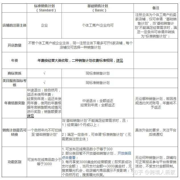 销售计划分为标准版和基础版,标准版入驻要求企业资质,入驻按照平台正常考核,享受平台各项政策,在类目权限下经营无限制,基础版限制比较多,企业和个体户均可申请,单店铺最多只能上传300个产品,且月销售最多只能做到3000美金,达到3000美金以后店铺所有产品将会被屏蔽,次月重新开放,所有建议卖家朋友入驻标准版。