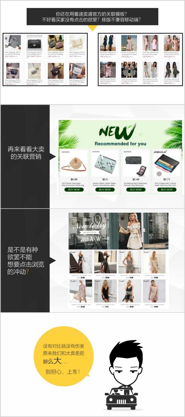 速卖通详情关联营销怎么做? 爱开淘 七月 3, 2019 业务发展 10 评论 1402 围观 请注意,下列方法就不要推荐了(缺点太多): 1、速卖通系统关联模板,不兼容无线、奇丑无比,手动操作太麻烦,后期修改维护更麻烦。 2、自定义代码、DW还是麻烦,修改、维护就是坑。 我要那种简单省事又灵活智能的,分分秒秒搞定的,后期维护也方便的。