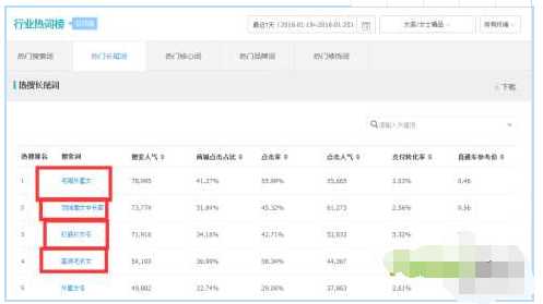 很多人喜欢分长尾词啊各种各样的东西,我不喜欢,我只知道如果你打算推一款女装的外套,那通过生意参谋-市场行情-行业热词榜、搜索词查询找出来的热门主词肯定就是“外套女”“毛呢外套女”“外套女冬”“外套女冬 中长款”等等这些。