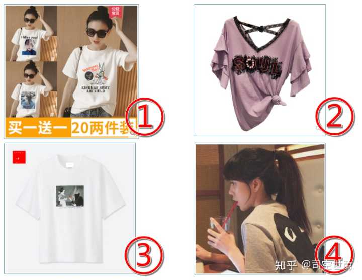 假设买家在搜索“T恤”这个关键词之后,看到了上图中的4款宝贝,你觉得他第一直觉想点的是哪个图片?