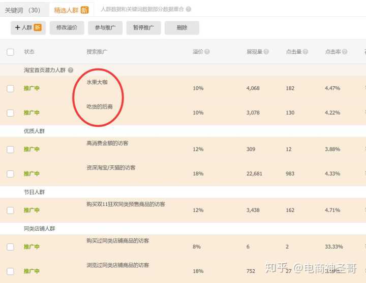 这里直通车应该怎么开呢?:可以用一个宝贝创建多个计划的方法,广泛匹配方式,尽量多点关键词(不过这个关键词需要和宝贝是有匹配相关度的,就算是很长的长尾关键词也不怕),然后再进行精选人群的关键词溢价,进一步提升流量的精准性和转化率,去弥补权重下降的点击率和转化的原因,这样能够保持权重的位置,不被搜索屏蔽且不被竞争对手占据。