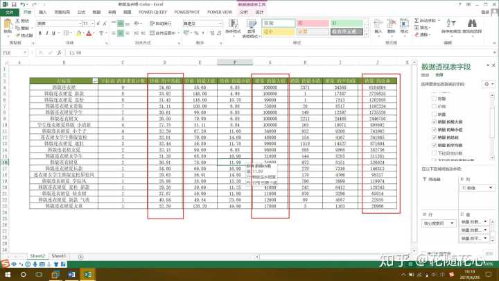 之后,再计算【价格】的平均值、最小值、最大值,以及【销量】的平均值、最大值、最小值,还有总和。