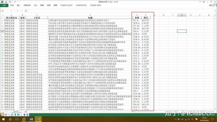 所以,通过这个简单操作,可直接查出和【韩版连衣裙】高度相关的下拉词有71个。除了可以帮我们关联更多高度相关的关键词之外,最重要的就是能查出每个词的销量排序下前20个爆品的价格、销量、标题数据。当然,目前我没有更新URL进去,后期再加入。