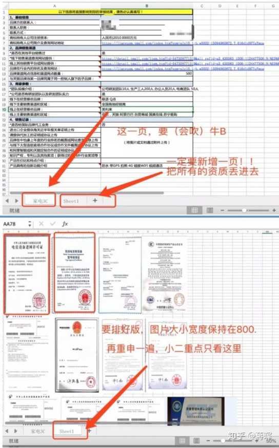 当下载好EXCEL表格的模板,打开之后你会发现只有一个页面,如果你的类目是需要有资质需求的类目或者偶尔才开放招商的,在这个表格里,你要再增加一个子页面,这个也是小二重点去看的,因为没有详情,小二是不会关注的。