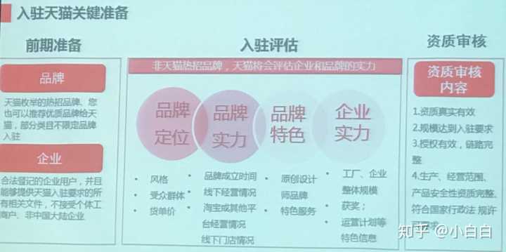 天猫缺的不是商家,天猫缺的是流量,放这么多的商家进来瓜分这有限的市场,显然阿里是不愿意的,所以我们在写商业计划书的时候一定要体现你的商品的竞争力,即增量,你不是来抢流量的,你是来贡献新鲜血液的,你的到来能吸引来一批淘宝没有的流量,我们申请天猫的时候第一步是由全渠道招商小二去评估,这个运营部门,能从你的PPT里面看到人群画像是什么,这一关过了,才会进入下一关,行业小二,行业小二再来评估这个类目是否已经饱和,如果已经饱和了,他会判断这个商家能否承载得住增量市场的流量,第三步是让品供和所有信息汇总的部门去做复核,这个过了,基本就是没问题了