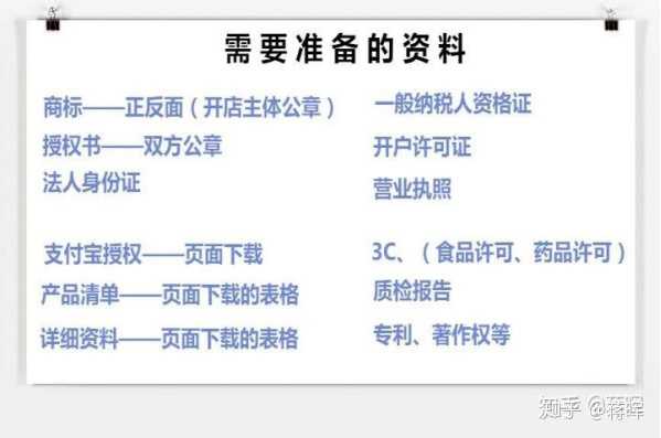 一般需要用到的商标正反面,营业执照,一般纳税人证明,开户许可证,法人身份证(签名盖开店主体章),支付宝授权,还有一些资质包括专利、质检报告等,全部都要加盖开店主体公章。