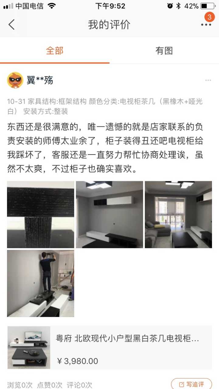 这两天的亲身经历,买了一个304不锈钢微波炉架子,到货后东西非常轻薄且吸铁石能吸住,于是客观的给了一个评价,说了说质量有哪些问题,包装有哪些问题,客服有哪些问题,天猫系统审核是通过的,结果显示了没几天我回去看了一下怎么都找不到了。天猫店可以删除评价?在买家完全不知情的情况下?这以后还怎么在天猫买东西啊?客户完全失去了话语权!我打了天猫客服电话,客服说我的评价判为广告,可以帮我申诉,目前正在申诉中,如果天猫客服和天猫店相互勾结的话,天猫也就这样了、不会太长远的。