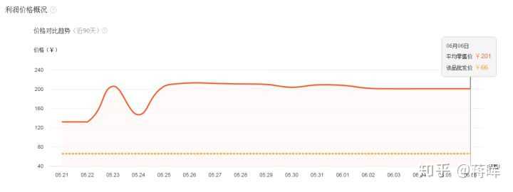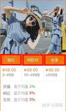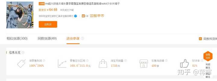 先看第一个淘零售利润,上面显示100%-200%,这数据代表在淘宝主流卖得好的店铺这款产品的售价的加价倍数,100%是加一倍,200%是加两倍。这款高腰裙的进价是64.68,也就是在淘宝零售中这款产品的主流价格是140多到200多,从这个数据可以看出这款产品在淘宝上还是有利可图的。