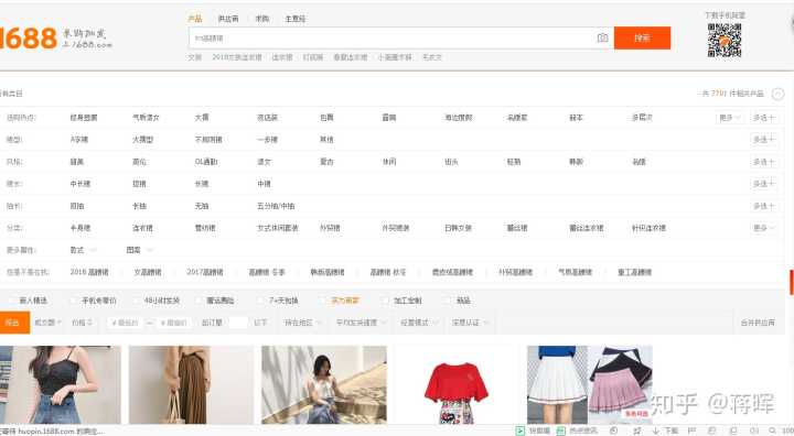 比如今年的ins高腰裙比较火,输入关键词后进行搜索出很多ins高腰裙的相关产品,同时看到非常多的供应商。在页面的右上角可以查看到有6896件 ins高腰裙的相关产品。