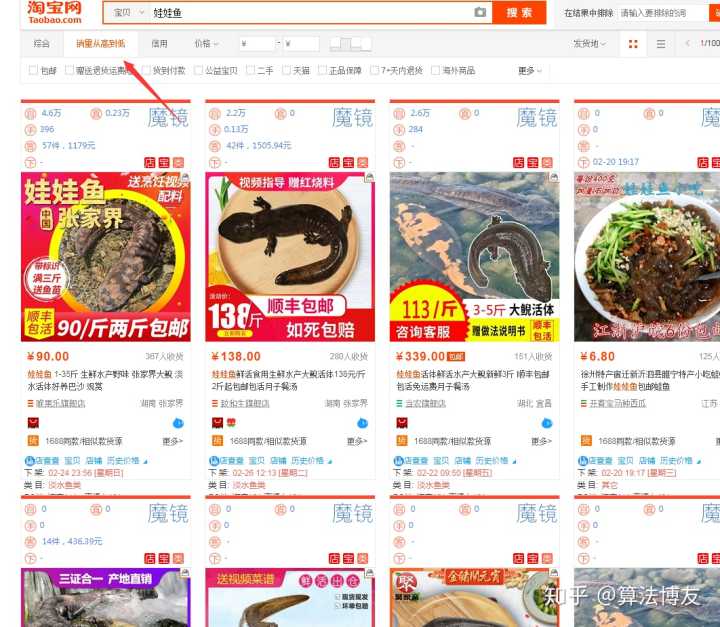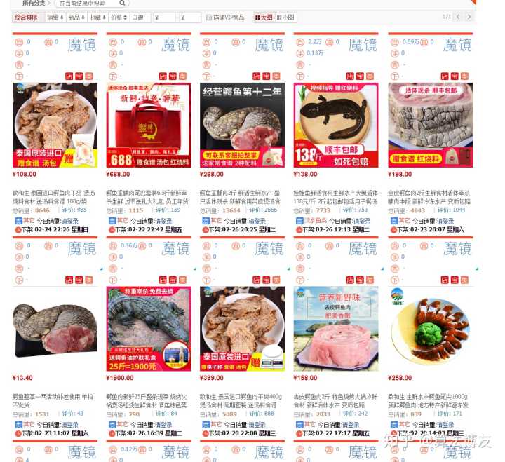 娃娃鱼:娃娃鱼的生鲜类目是去年淘宝才放开的,如上图所示,按照销量排序,卖的最好的也才三百多单,三万的销售额,大卖家是看不上的。