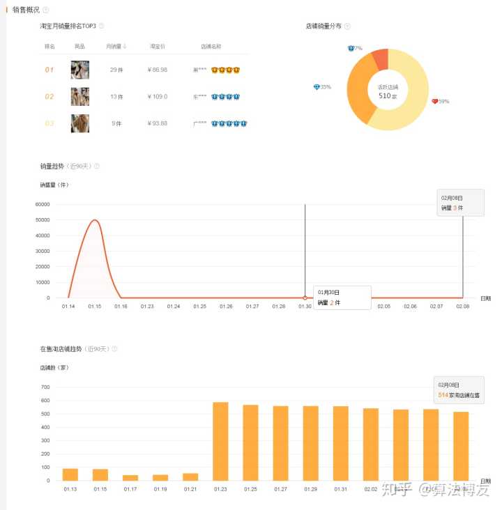 我们选择一个产品,点击一下淘货源插件的进货参谋功能可以看到这款产品在淘宝店铺的销售情况。