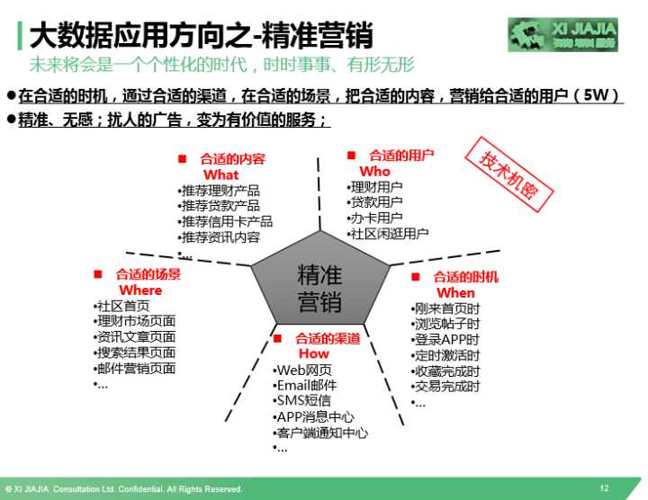 大数据精准营销,用一句话概况就是“利用大数据手段在合适的时机,通过合适的渠道,在合适的场景,把合适的内容,营销给合适的用户(5W)”