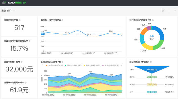 数据可以指导广告投放的前提是能够正确的解读数据。比如前文所说的混淆了因果关系和相关关系的情况,以局部视角诠释整体格局的误区等等。企业要对数据变化敏感、更要对数据变化背后的原因敏感。企业如何提高数据的敏感性呢?DataHunter就能帮到你了。Data Analytics是一个轻量级业务数据可视化平台,可一键快速接入企业本地和云端内外部Execl/CSV等数据文件,无需编程仅需简单的拖拽即可制作酷炫的数据可视化看板,用直观的数据帮你做好的决策。