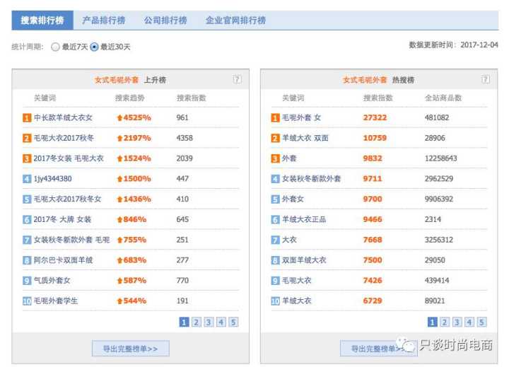 在阿里排行栏目,提供了搜索词排行榜,可以把榜单下载下来。 从这些搜索词里,我们可以发掘对款式、面料的需求。