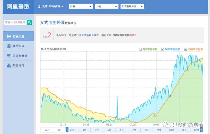 从上图,我们可以看出女士毛呢外套,从7月下旬搜索热度增加,到10月下旬需求出现了高峰。而这时商品供应数没有及时跟上,直到11月底才追上。