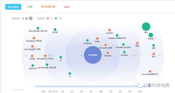 同样从这个图里,我们能看出Loro Piana 会和LV ,Maxmara,Brunello cucinelli这样的品牌,一起被搜索。这说明用户知道,这几个牌子的产品或定位类似,会一起比较。