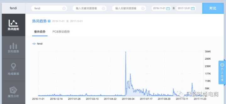 功能:1个月、3个月、6个月、自定义时间的热词趋势,可以多词对比。