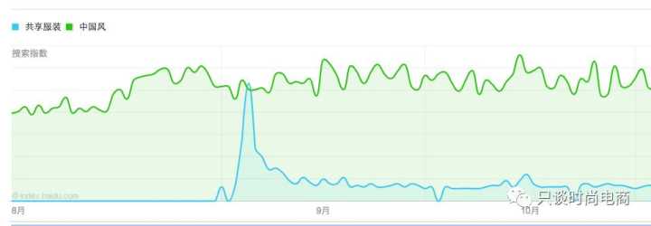 用法3:查看和品牌相关的行业词,或者你想主打的品牌理念。比如下图是“中国风”和“共享服装”的对比。可以看出“中国风”的热度是缓慢增长,而共享服装在8月之前默默无闻,8月下旬出了一个高点之后就有了一定稳定热度。