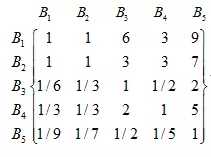 接下来,要形成完整的评价模型,还需要根据每个指标的重要程度进行赋权,赋权的过程涉及一些运筹学的方法,需要构建判断矩阵,原理示例如下图: