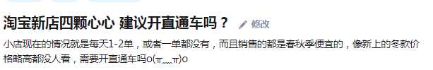 淘宝新店四颗心心 建议开直通车吗? 爱开淘 七月 11, 2019 业务发展 20 评论 781 围观 小店现在的情况就是每天1-2单,或者一单都没有,而且销售的都是春秋季便宜的,像新上的冬款价格略高都没人看,需要开直通车吗o(╥﹏╥)o
