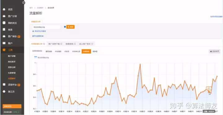 我们在直通车流量解析中查看这个词过去90天的数据,这个词在4月15日之前只有一千左右的搜索人气,然后突然有一个大幅度的飙升,有了4万多的数据,但是他的市场均价暂时还维持在一个较低的价位。