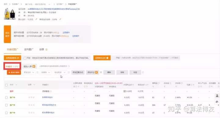 我们可以来看看低价引流的计划中,我们推广的宝贝数量,以及每个宝贝包含的关键词数量。