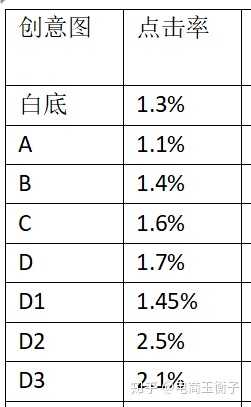 第三部:调整关键词出价,控制创意图的展现量,累计2-3天,并且单个创意图积累展现量达到2000以上,保证一定的展现时长和展现基数,这样测试出的点击率会比较稳定,更有参考意义。在数据记录里我们发现白底图的点击率是1.1%,那么推广的创意图点击率必须高于白底图的点击率才更有意义,例如创意图A就是比较失败的图片,创意图D的点击率比较高,我们还可以根据创意图D进行衍生,并且和创意图一起进行测试操作,并且记录点击率数据,通过再次测试我们挖掘了创意图D2,D3.