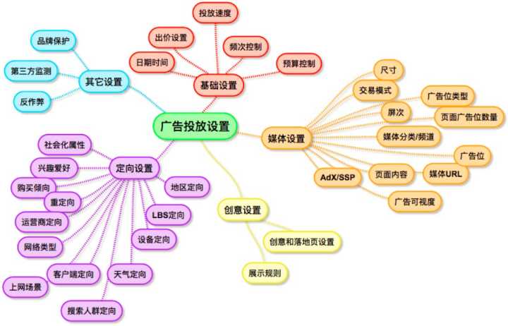 (1)广告类别(2)出价模式(3)出价(4)设备属性(5)人口属性(6)网站属性(7)兴趣标签