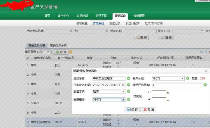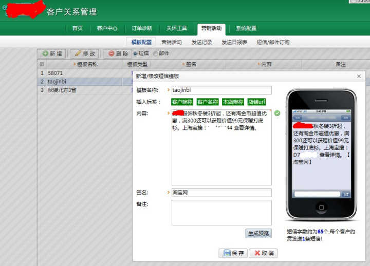 这个软文,很好的介绍了一款非常实用的CRM系统,可以通过建立顾客模型,选择有针对性的顾客进行营销活动,还有短信发送功能,有短信预览效果,并且可以定时发送,可以早早做好,设好时间即可,当然还有一个非常帮的功能,就是效果监控,发送人数,评估期间的购买人数,销售金额,转化率等等,都可以通过效果监控来获知,可以很好的评估这次营销活动的效果。当然也顺便给“淘代码做了一个广告”。