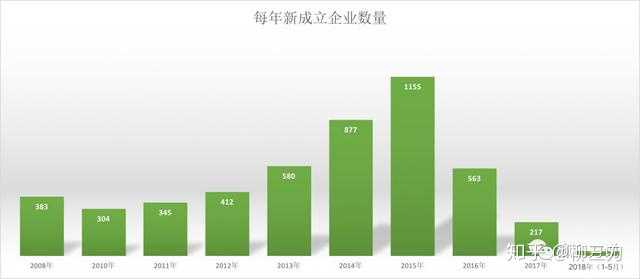 从2008年至今(2018年5月),这十年间共成立了4867家互联网+医疗企业。从2008年到2013年都是平稳增长状态,到2014年新创企业呈井喷之姿,到2015年到达顶峰。这一年热钱疯狂涌向互联网+医疗企业,初创企业如雨后春笋般层出不穷。而到了2016年,初创企业急剧下降。一方面,2016年资本寒冬,投资市场逐渐回归理性,倒逼行业成熟;另一方面,经过七八年的发展,互联网+医疗市场格局基本已定,初创企业切入新蓝海难度增长。
