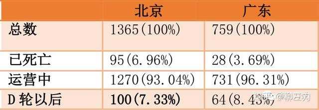 对北京和广东的企业进行死亡率和融资情况分析,发现一个很有趣的现象。北京互联网+医疗企业总数远超广东,差值近两倍。但企业死亡率竟是广东的两倍,而D轮以后企业数也败给了广东。
