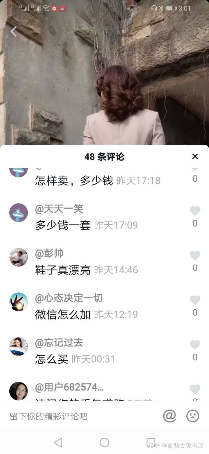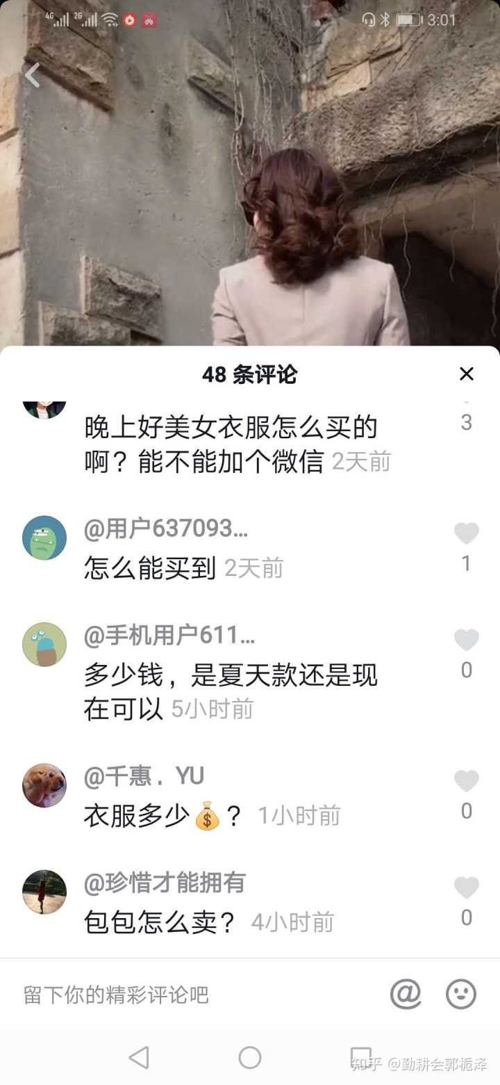 这个上海少妇每天都换上不同的服装,到这样的场景里走上一圈,我们看看她的抖音账号下面的评论,都是在问微信号、问多少钱,就是要以高铁般飞机般火箭般的速度快!点!买!就不能端庄一点、含蓄一点、委婉一点,就不能私信她,不让我们这些看官看到吗?