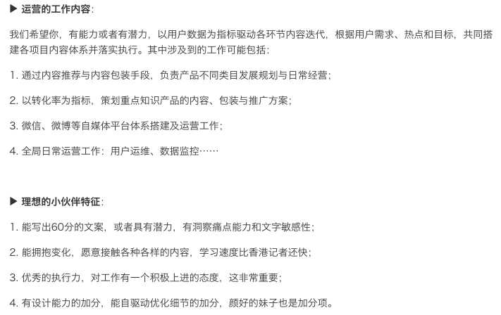 3、如果你喜欢写文章,喜欢看文章,喜欢做一些小视频等等,你可能更适合内容运营或者新媒体运营的岗位,而这两类岗位更容易出现在内容型产品里,如今日头条、微博、知乎、咪蒙等团队。