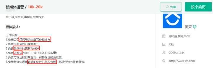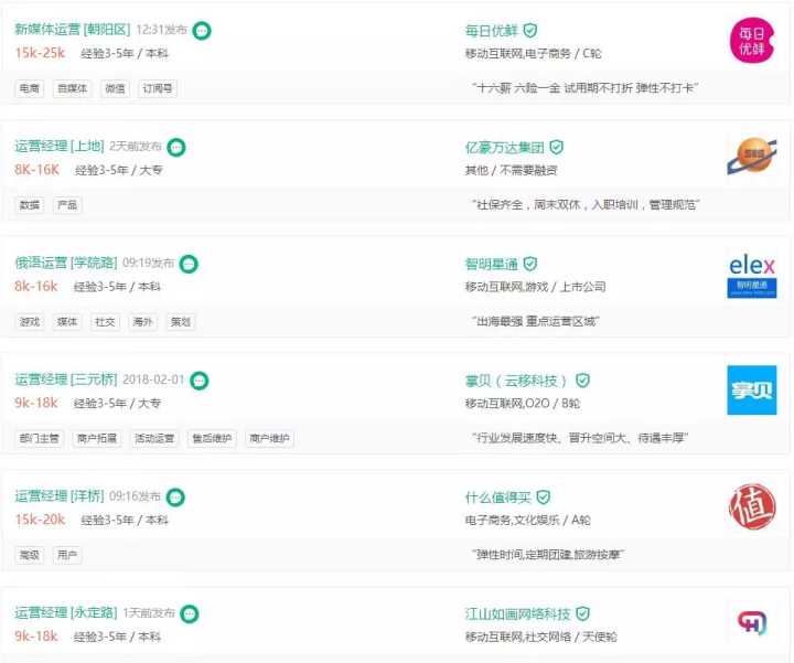 老师提醒我不要只盯着所谓的大公司,而是要找自己感兴趣的领域里面做得好的公司,做好准备去求职。我思考之后结合个人兴趣和发展规划,定位在“互联网+教育/文化”领域,同时工作内容上能够让我和用户进行大量沟通,最好是涉及到一定的社群管理。脑海里有大概的轮廓之后,我开始在拉勾和直聘上进行筛选。