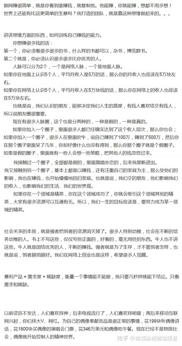 ① 微商项目投资人:但他们承担着非常大的资金风险,现在的微商,明星代言、卫视广告、送代理等几乎成了标配,起盘一个微商项目没有百八十万是很难闹出点动静的。而且,微商的一大死穴是信任度,消费者购物没有保障,终端很难出货,所以形成了目前微商卖微产的局面,大家都是在通过招代理的形式,让下家层层囤货,造成了顶端个别投资者赚钱,下级代理生存困难的现状。我16年底的时候写过一篇博客《微商,一场弱肉强实的打劫》,大家有兴趣可以搜索来看。 ② 微商项目的顶层代理:他们承担的是相对较少的资金风险,但最大的风险是时间成本以及精力投入,只有超负荷的付出以及非常广的人脉(但很伤人脉),才有可能成功,但这个成功的主导因素还不是在自己手里,而是要取决于他的上层,一旦上家产品或者政策出现问题,团队马上就散掉。 至于那些刚入行的微商小白,只能在这个食物链当中成为庄家的猎物! 第三类、做梦类(推荐星级无)